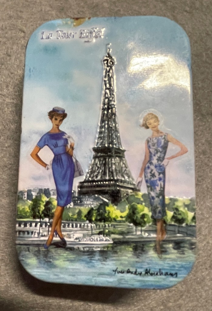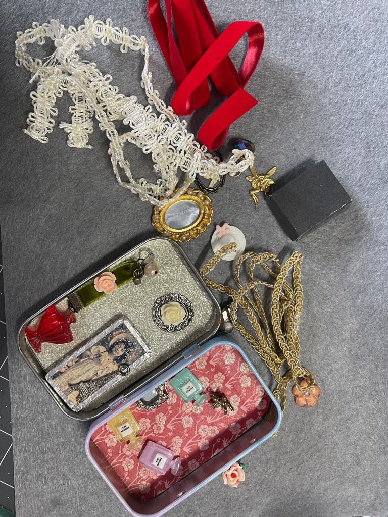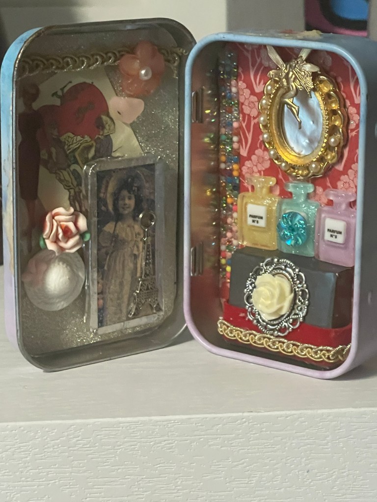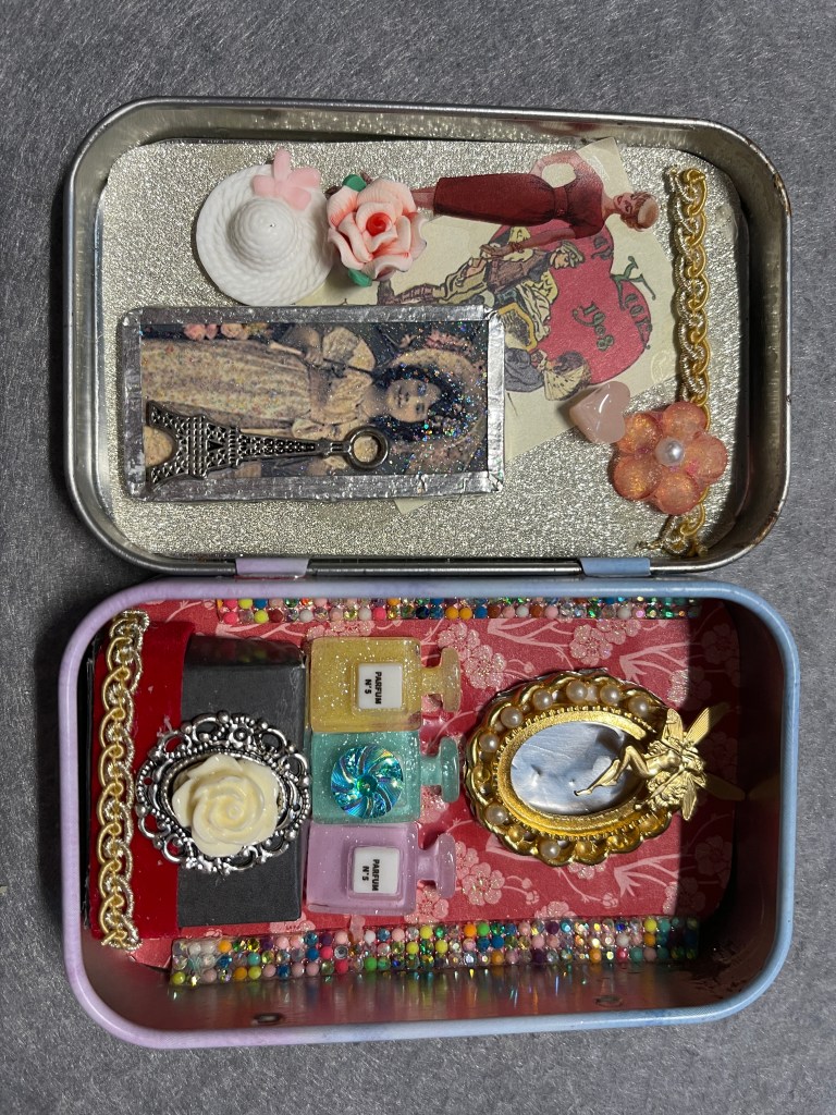 After creating a Parisian-style wallpaper inside the tin, crafting a miniature table from a cardboard box, adding velvet ribbon and lace for flair. Then I incorporated tiny bottles and a mirror made from a broken brooch and the scene came together. I completed the vignette with bejeweled stickers, vintage-style art, and cabochons, and the creative process became a serene afternoon. Enjoy the final creation. I needed this to jumpstart my creativity.