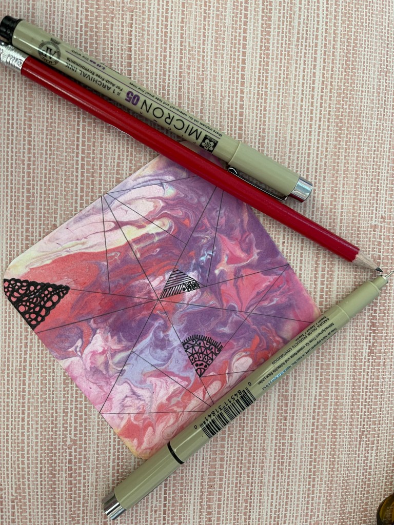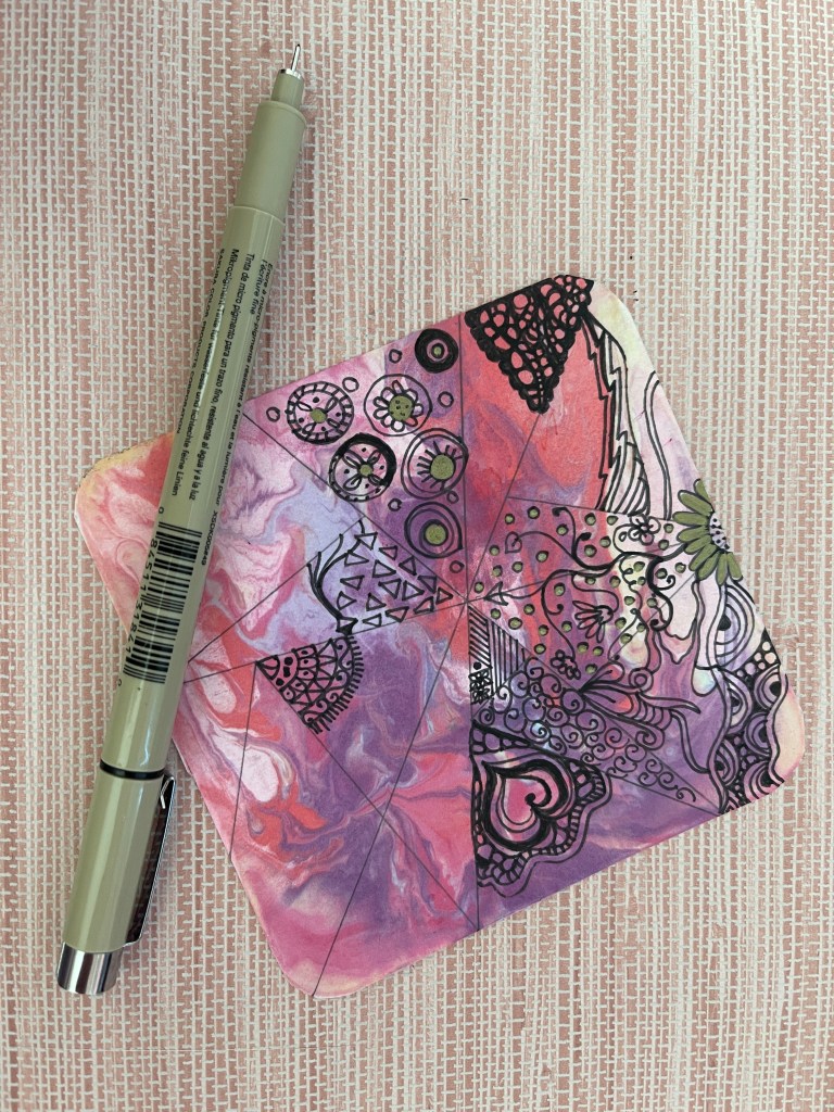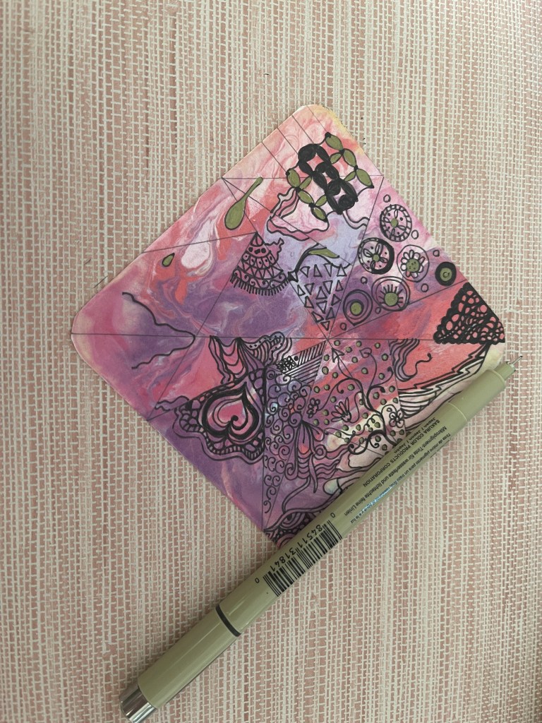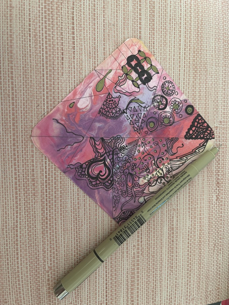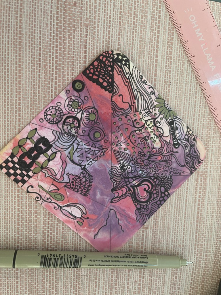 I spent the day yesterday completing this Zen doodle. I went about my Sunday laundry chores and randomly returned to working on the squiggles. Following this organic and mindful process of Zen doodling, the sense of tranquility it brings is unparalleled. This method allows me to creatively express myself and acts as a therapeutic escape from the stressors of daily life. The intricate patterns and the attention to detail in filling those triangles with a fine-tipped pen require a level of focus that effectively silences any external chaos. These moments of deep concentration and artistic flow help my anxieties melt away. It is replaced by a serene calmness. This practice, simple yet profound, underscores the notion that sometimes, the most effective form of self-care is found not in escape but in meditative engagement with the present moment through art.