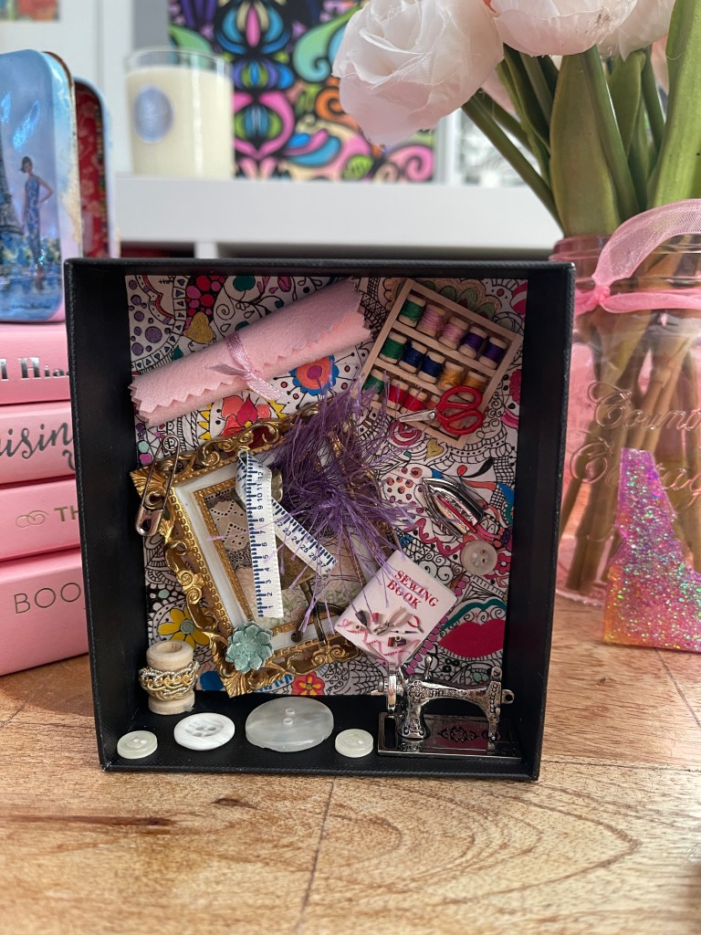 I rummaged through my craft supplies to find suitable pieces. The final creation includes items from my craft room, along with a thread container and sewing machine I recently bought. The pink fabric is from a glass cleaner that came with my latest eye prescription. I utilized ribbon and buttons from my existing collection. The frame, bought years ago at a thrift store, was part of a set of three for 50 cents. Arleens tacky glue secured everything in place. Although I’m unsure of the purpose of these creations, I find the creative process incredibly soothing. My next project might involve crafting Amigurumi crochet creatures. I received a Crochet Society box that included a book of instructions for making Amigurumi. I’m hesitant to follow precise directions since I prefer a more freestyle approach. Stay tuned for updates; I aim to share my progress in the next few days, even if it’s a bit of a challenge.