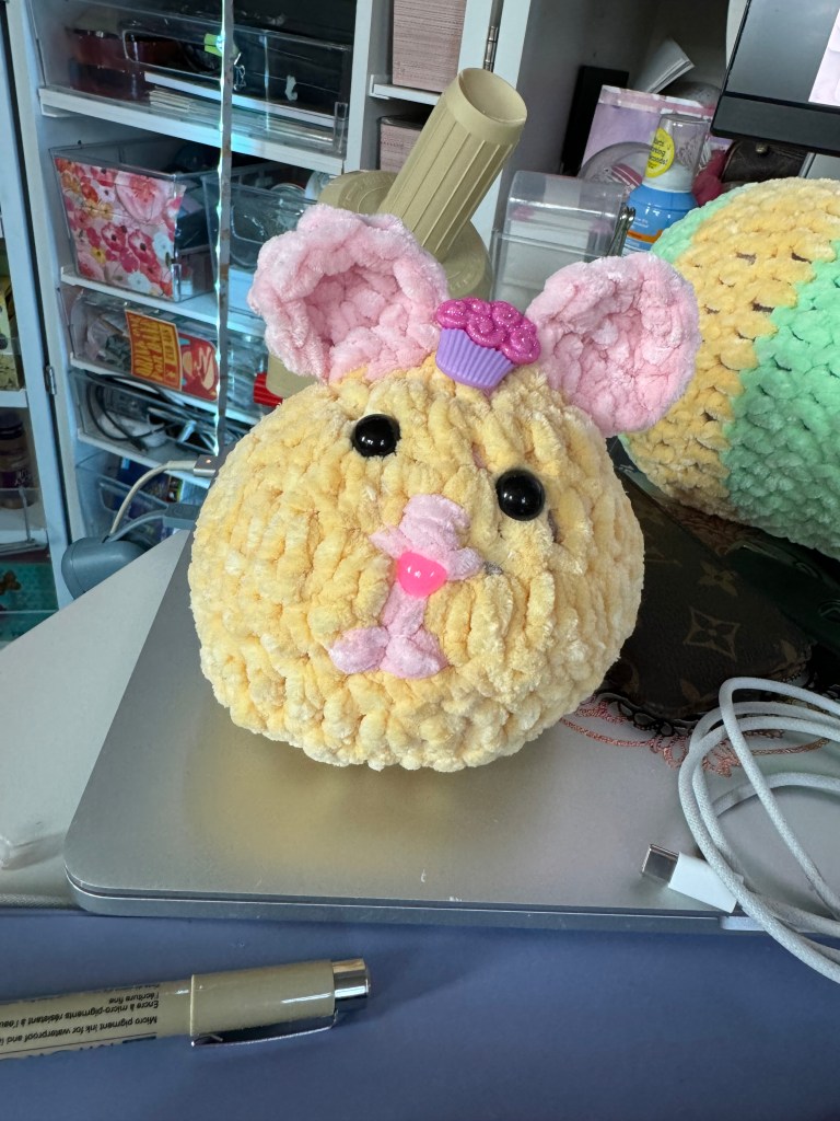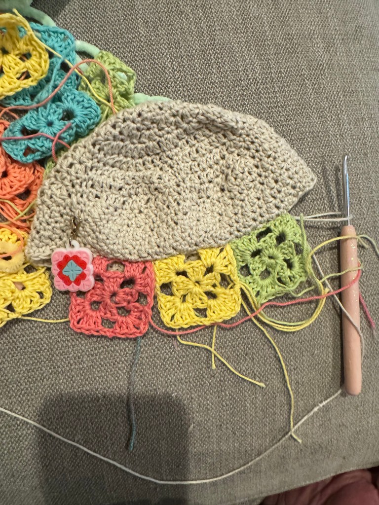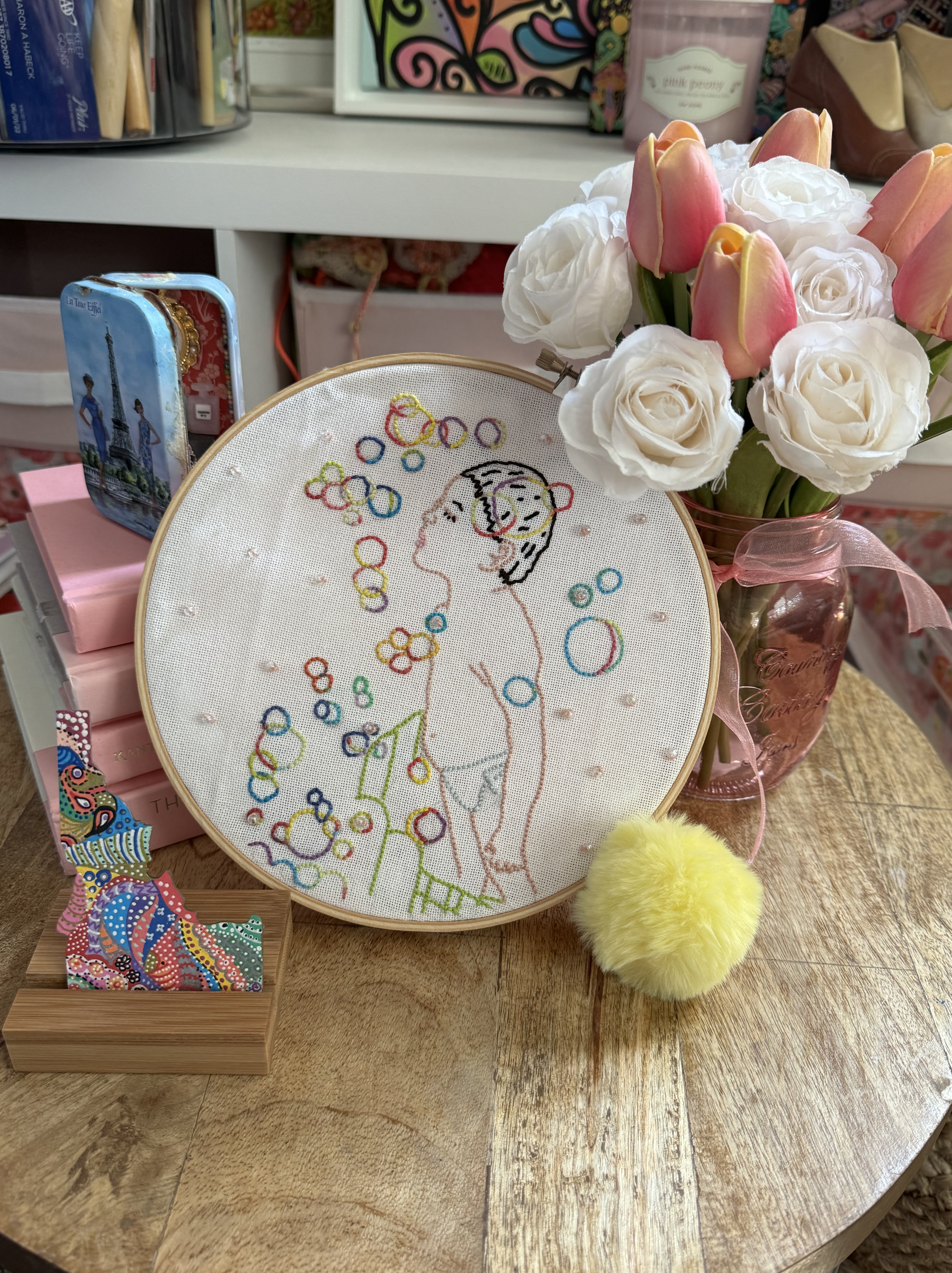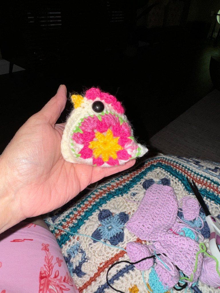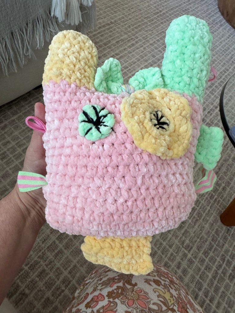 Promises, promises. I biffed it, have been doing all kinds of things, and have just not had the energy to share. So, let me give you a Reader’s Digest Version. I have had a lot of time to sit and create because I have developed Bursititus on my good side, and walking around and going places has been too painful. So, I have been playing around in my craft room doing many weird and beautiful things. I have not posted in two months. We have had visitors as well. My mom-in-law came on the 4th of July, and then our son visited last week. Here are some of the things I have worked on. I still love crocheting. As I mentioned, I love to freestyle, so here are some of my creations. I made a tag-type toy for a relative’s niece using ribbon and soft chenille yarn to create super soft lovies. I found an adorable one. I also created an abstract embroidery stitching for my niece’s little nephew. She had a cute picture of him standing in a wading pool and admiring the bubbles they were blowing around him.