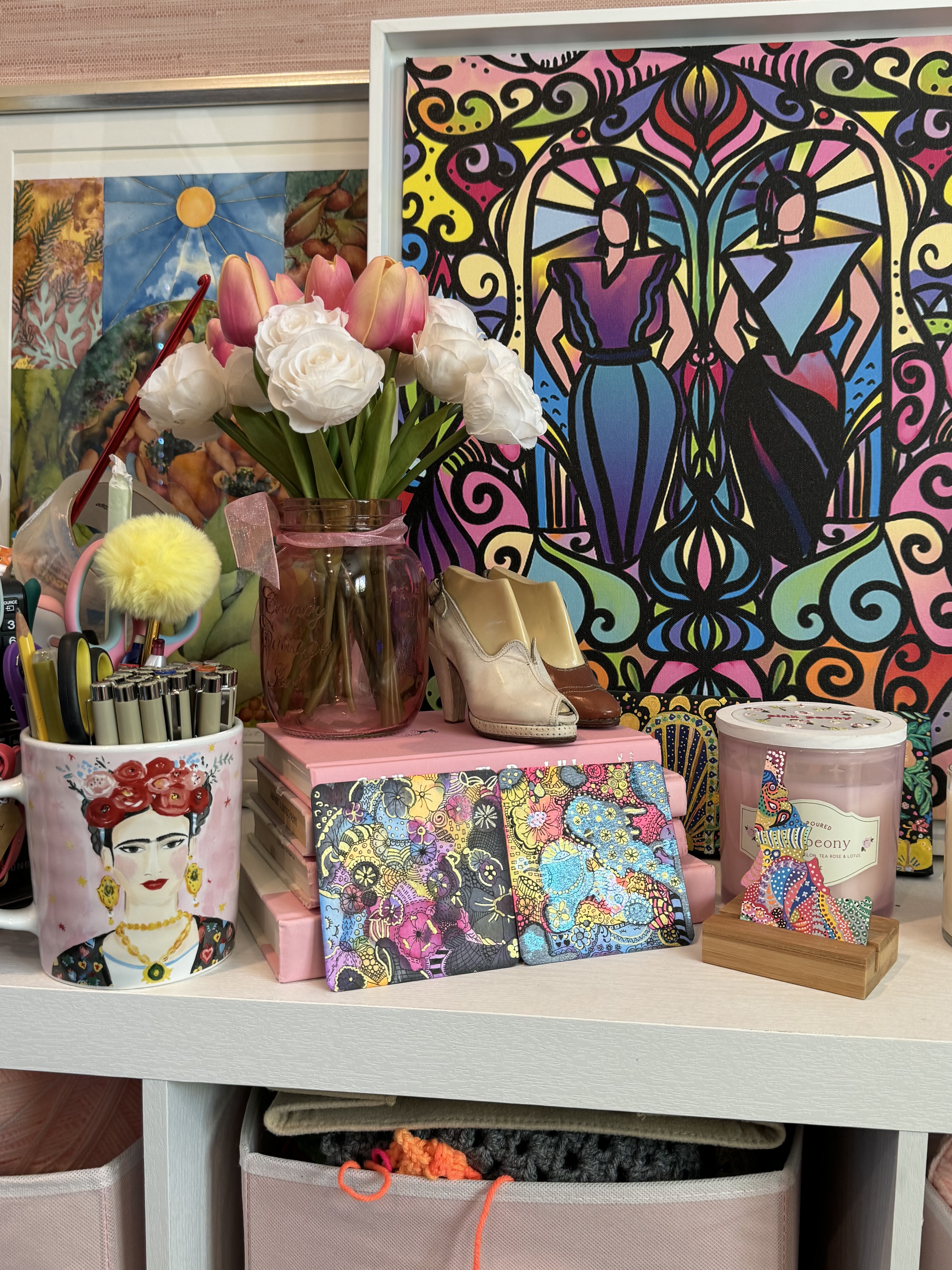 I created a teddy bear with no pattern. She turned out to be a real diva. She has glitzy Frieda Kahlo earrings, a necklace, and a bracelet. I had this goal to add more titles to my Maeve book series. I worked at completing Maeve Goes to Kindergarten and a variety of themed alphabet, color, and shape books. There are now seven books in the Maeve series available online. They are selling at a slow but steady pace on Amazon. The other projects I love to spend time on are doodling intricate patterns and using ink and markers to complete little art pieces. You can tell I have made good use of my downtime staying out of the heat and off my painful leg. Thanks for the visit. I hope I can be more diligent in getting regular posts. However, do not hold your breath. There is a group at our local library that crochets toys for charity. I need to go and take a peek at their next meetup. I also found wallpaper and fabric matching the chair I bought for my office. Riflepaper makes a large variety of items in each pattern. I want to make covers for my dream cart, which looks untidy. My desk is very well-used, and I wish to dolly it up by making a skirt to cover up the questionable appearance of a well-loved and well-used craft center.